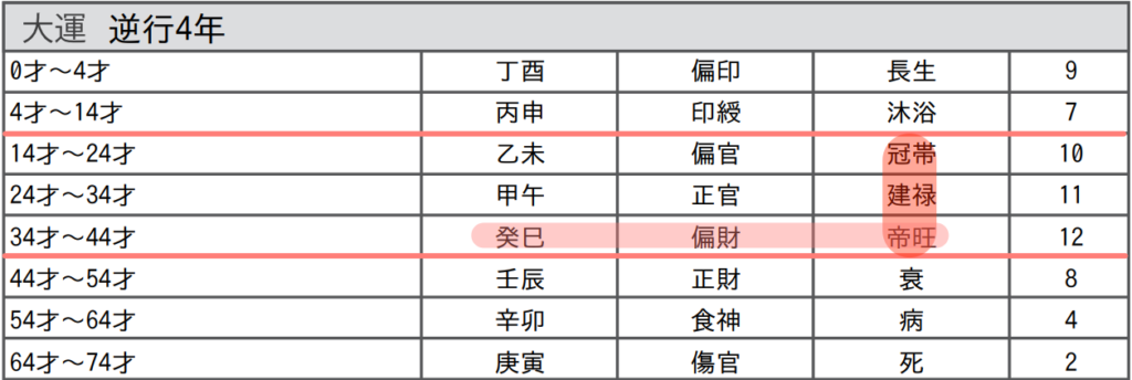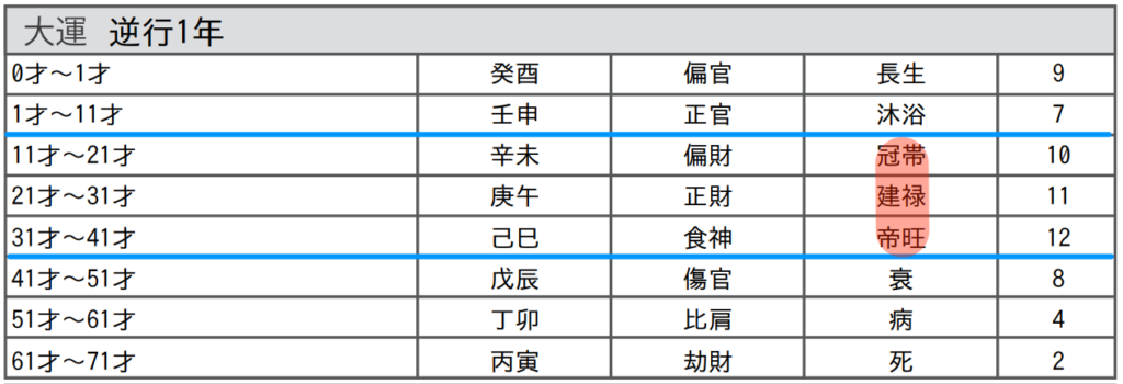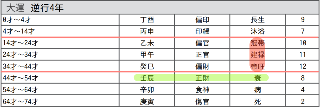 現在のごにーさんの大運(社会運、キャリア運)には3つある身強の星で最もパワーの強い【帝旺】が巡っています。