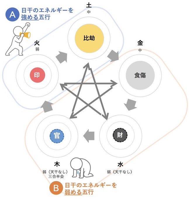ちなみに、ごにージュニアさんの五行バランスは、官星 / 印星陥没タイプ。