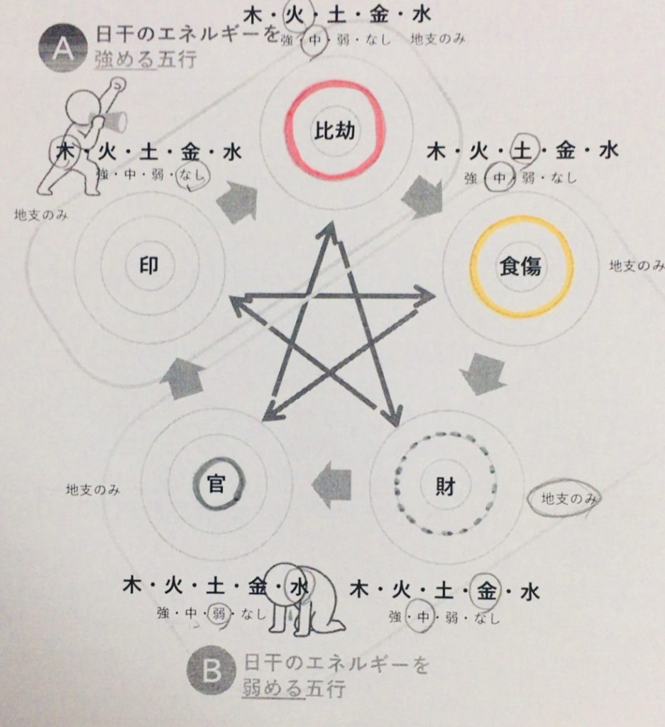 - 【印】に星がないため「しっかり勉強すること」で【印】の五行をおぎなうこと。【印】は木の五行=読書、とくに紙の本は開運につながるアイテム