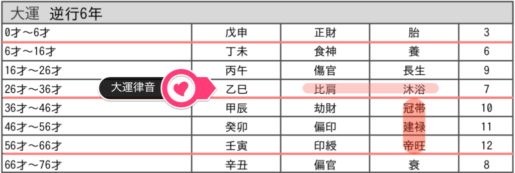 以下の26歳〜36歳の大運に巡る干支【乙巳】を見てください。