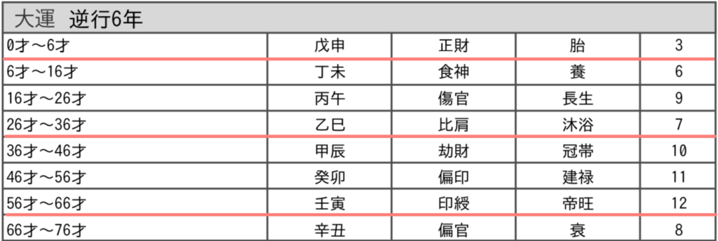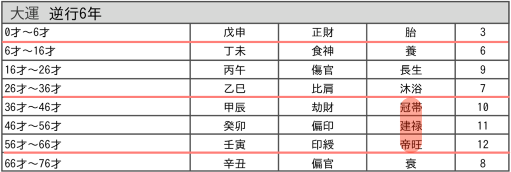 そう考えるのは、上でも述べたように36歳〜66歳までの30年間が、身強の星 が巡り超絶パワフルなキャリアの発展運だからです。